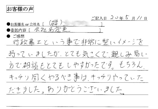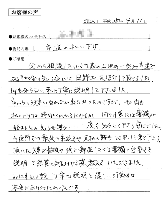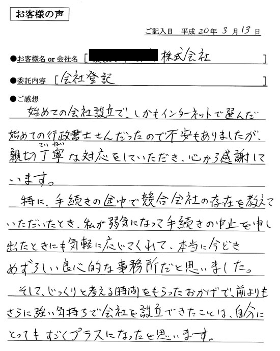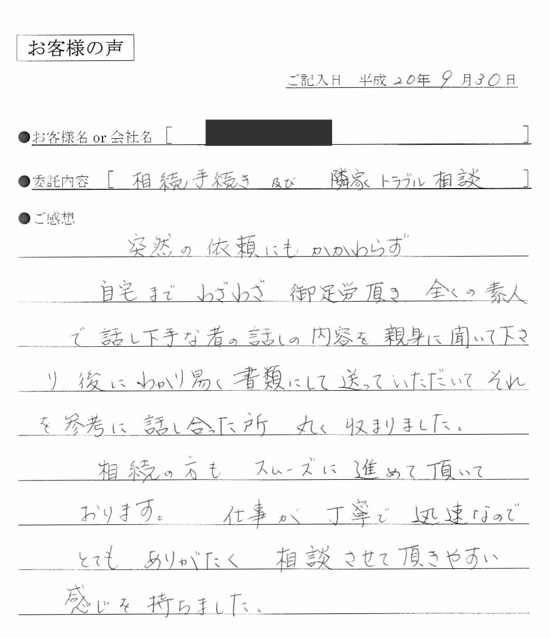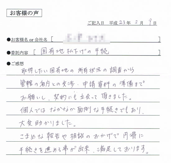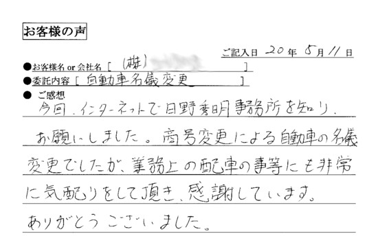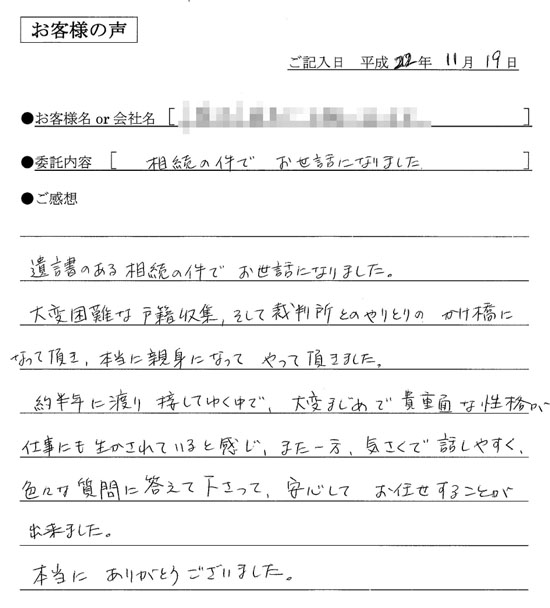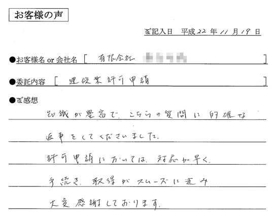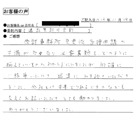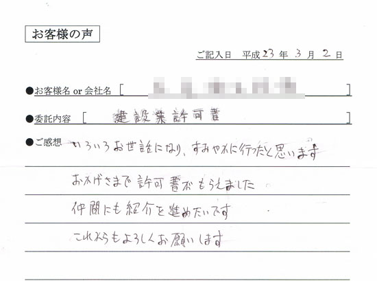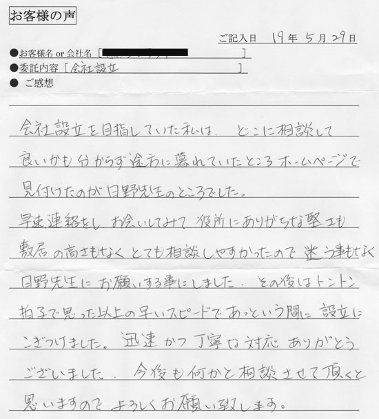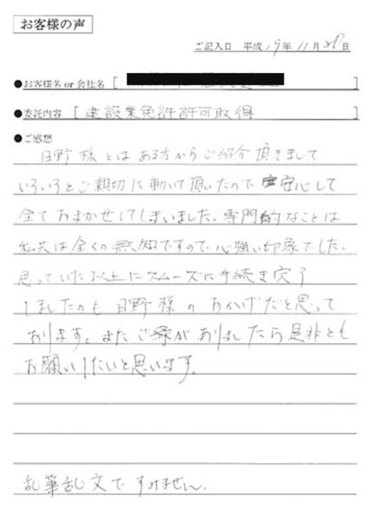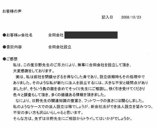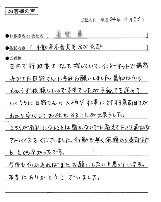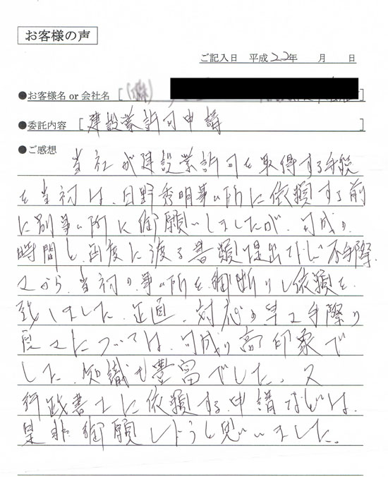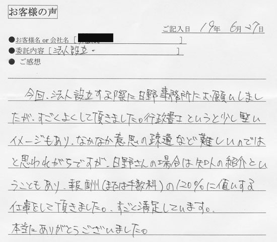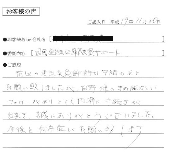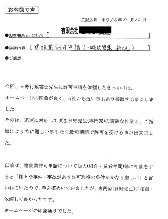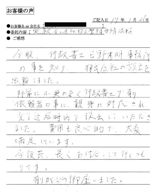 現在位置:行政書士 日野秀明事務所 TOP>お客様の声